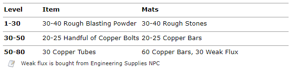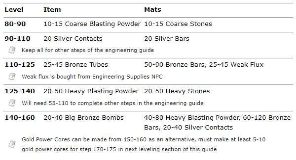 In some instances you will have to keep some of the engineering materials you craft to use them later down the road in this leveling guide so I highly recommend that you keep components based off expansion. Everything you make from 1 to 300 from engineering keep until you reach 300 and it might be safe to sell. Then keep everything you make from 300-350, once you hit 350 you’ll be switching to Northrend stuff. I will try to make a note to tell you what stuff to keep when possible.