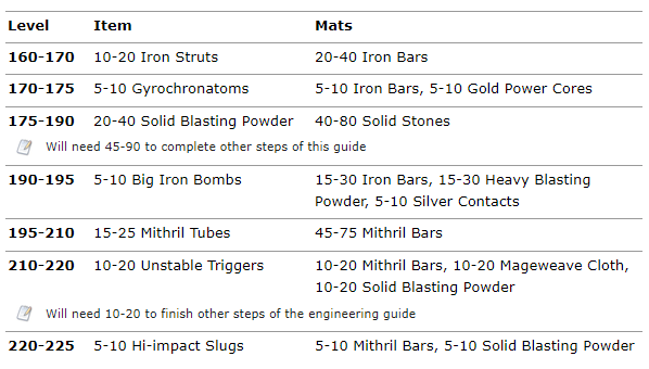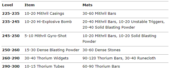 This part of the engineering leveling guide will start to get expensive because you’ll have to buy all of the Thorium and Mithril bars if you don’t farm them yourself.