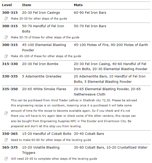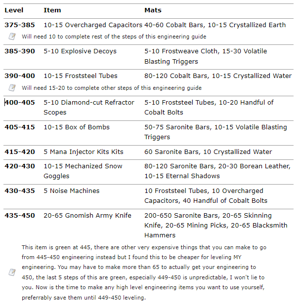 At skill 350 you will be switching to Wrath of the Lich King stuff for leveling because it’s a lot cheaper. This may require you to go to Dalaran or the starting city in Northrend and train the engineering recipes as you go past 350 leveling.