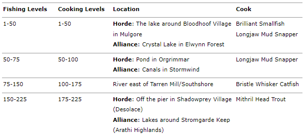 This Fishing and Cooking Leveling Guide is updated for patch 4.0 and Cataclysm.