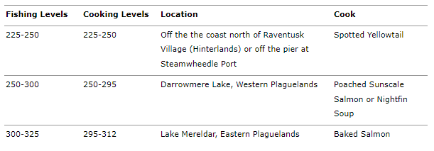 For this section be sure to have the recipes for Brilliant Smallfish, Longjaw Mud Snapper, Bristle Whisker Catfish, and Mithril Head Trout. See the chart above for where to buy them. Now have fun leveling!