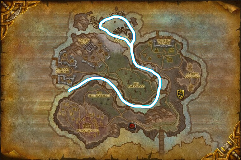 Below you’ll find the route for farming Azshara’s Veil in Tol Barad Peninsula. There really isn’t a loop that you can follow for the whole zone since the areas highlighted in the map below are the only areas of the zone that you can find this herb, so it’s up to you as to how you repeat or loop back around on this route. The circled area at the top of the map contains herbs within the inside of the loop so feel free to venture into it.