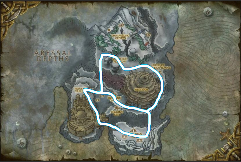 Here is the best route to follow when farming Azshara’s Veil in Abyssal Depths. This route is pretty simple, just follow the loop outlined on the map below and you should have really good luck collecting all of the herbs you need.