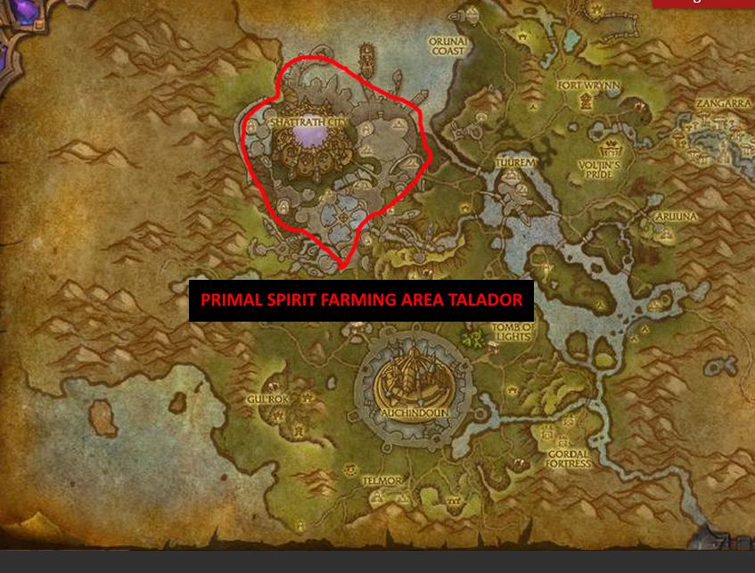 Every herb that you run across has roughly a 10% chance to give you a Primal Spirit. The first thing to do is to get all of the Herbs out of your Garrison Garden. The next thing to do is head over to Talador and run some of the areas that have Talador Orchids (herb everything you can not just these). There are a few areas you can loop as shown in the map below.